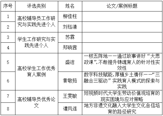 根据《关于评选2024年湖南省高校辅导员工作研究与实践先进单位、先进个人和学生工作研究与实践先进单位、先进个人的通知》、《关于评选2024年湖南省高校辅导员优秀论文的通知》、《关于评选2024年湖南省高校学生工作优秀育人案例的通知》要求,经个人申请,学工处综合评议,现将各项评选活动拟推荐名单予以公示。