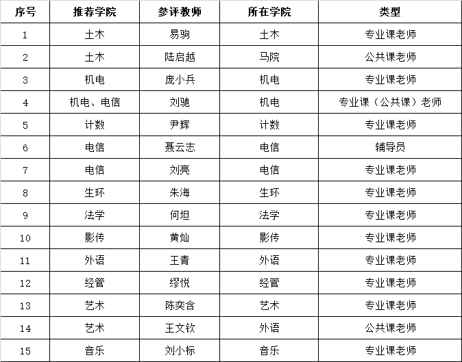 经过班级推选,学院初选,网络及线下投票复选,在组委会综合评定后,最终确定15名获奖教师名单。