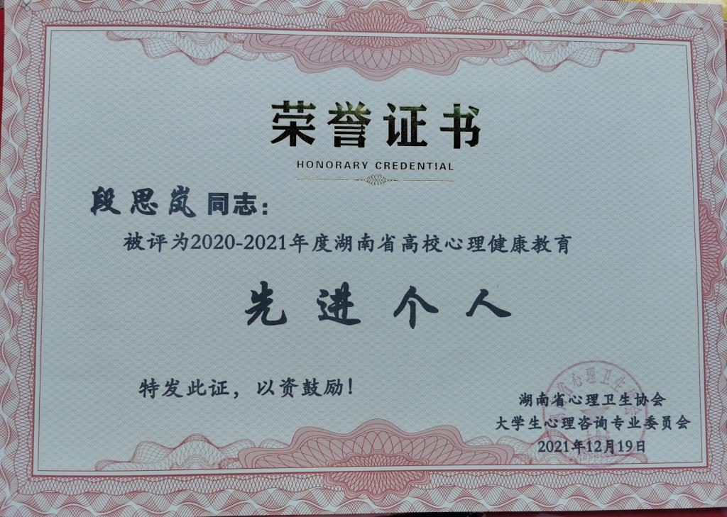 我校心理中心专职教师段思岚老师被评为湖南省高校心理健康教育“先进个人”。