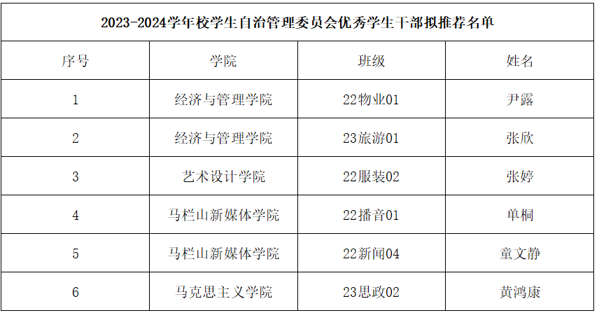 2023-2024学年校自治管理委员会优秀学生干部 拟推荐名单公示