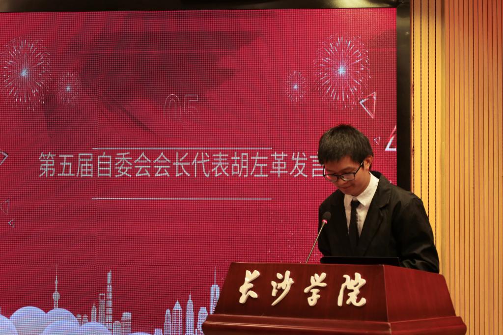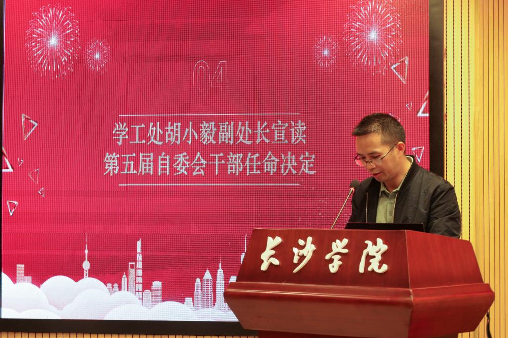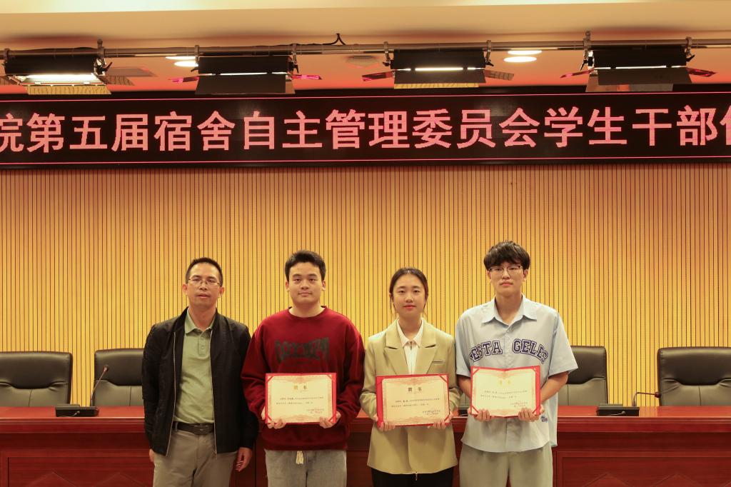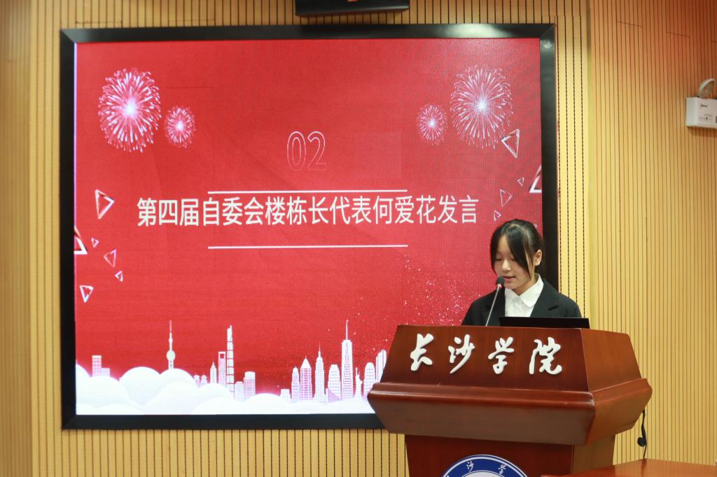 学校宿舍管理中心老师为第四届自委会会长及楼栋长颁发聘书。第四届自委会会长姜苗同学做上一学年自委会工作汇报。她对第四届自委会全体成员表达感谢,并寄语第五届自委会“集思广益,反躬自省”。第四届自委会楼栋长代表何爱花同学对楼栋长工作进行了总结。她认为,只有多方协同努力,才能使得自委会的发展呈现出百花齐放、欣欣向荣之姿。学工处胡小毅副处长宣读第五届自委会干部任命决定书。第五届自委会会长代表胡左革同学做表态发言。他表达了新一届学生宿舍自主管理委员会的工作设想和决心,提出将以“为广大同学服务”为宗旨,承担好新一届自委会干部的职责和使命。