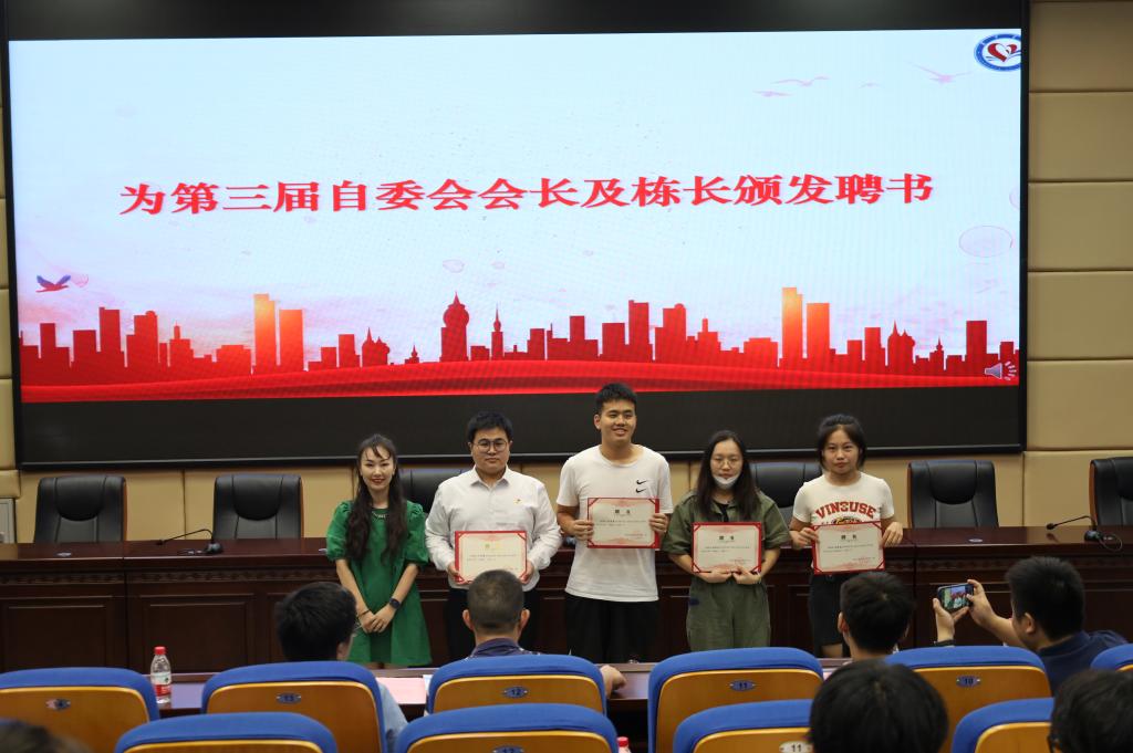 学工部老师为第三届自委会会长及楼栋长颁发聘书。第三届自委会会长肖诗然同学做上一学年自委会主要工作汇报。他对第三届自委会全体成员表达感谢,并寄语第四届自委会“荣誉面前思进取,携手共进创辉煌”。第三届自委会楼栋长代表牛军辉同学对楼栋长工作进行了总结。他认为,宿舍管理工作是一个长远的工作,不是一朝一夕就能做好的,希望下一届自委会能够在已有的基础上推陈出新,革故鼎新。