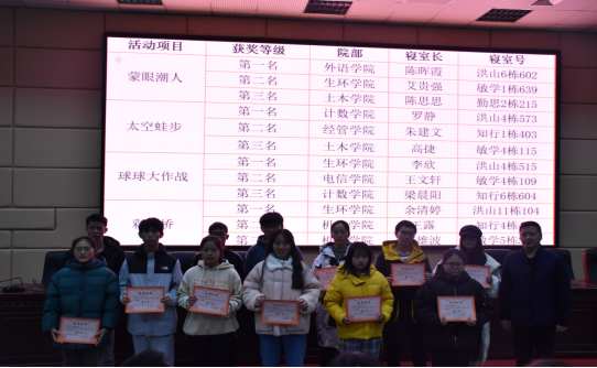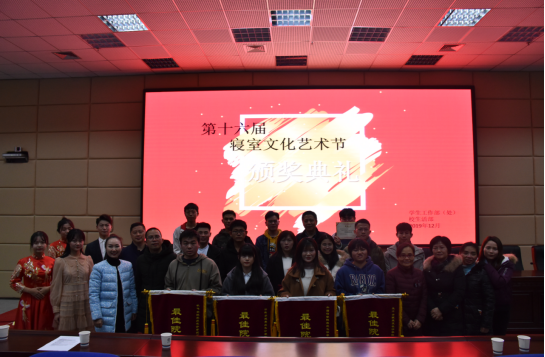 为了向全校师生展示我校学生乐观积极、敢于拼搏、锐意进取的精神风貌,同时激励全校学生更多参与,对此次寝室文化艺术节中表现优异的寝室、楼栋表示嘉奖,学生工作部(处)于12月20日晚7点在致远楼学术报告厅进行第十六届寝室文化艺术节颁奖典礼。参与此次颁奖典礼的嘉宾有学生工作部(处)副部(处)长胡小毅、计数学院党总支副书记廖良梅、学工部宿管中心陈龙山、宋颖、胡立,计数院辅导员陈昊、影传学院辅导员谭凤连、电信学院辅导员聂云志、机电工程学院辅导员王鲁腾以及各学生宿舍园区主管老师。