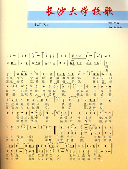 第六十一条 校歌为《长沙大学校歌》,李峻作词,徐乐华作曲。