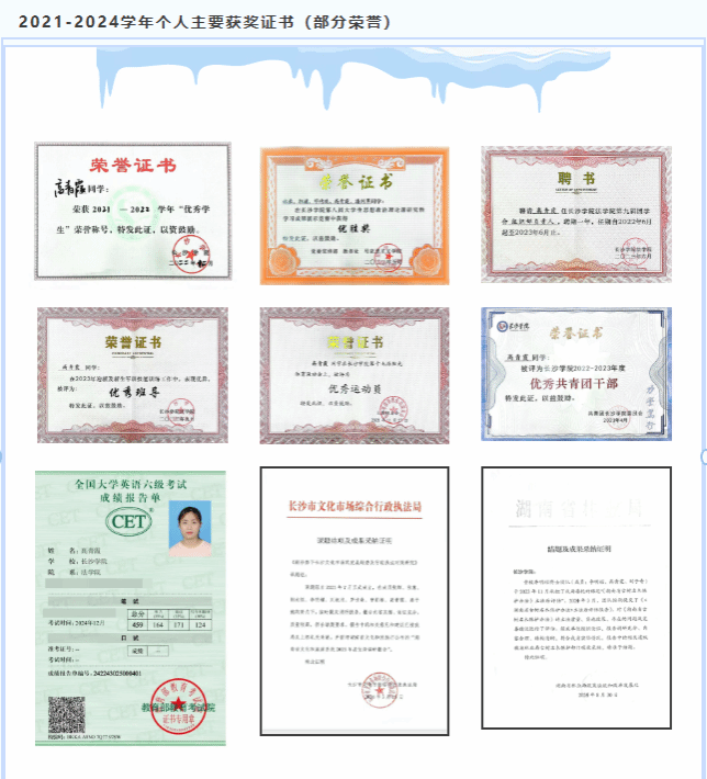 深耕不辍,筑牢专业根基。从踏入法学院的第一天起,我便将“专注”二字刻入学习日常。正是这种“较真”的态度,让我连续三年稳居专业第一,斩获国家励志奖学金、校级“优秀学生”等荣誉,并考取国家法律职业资格证书、英语四级、六级,计算机一级、二级、普通话一级等多项证书。
